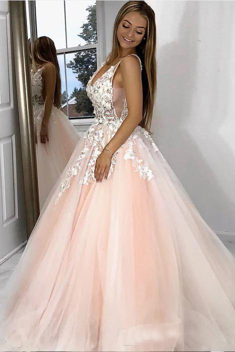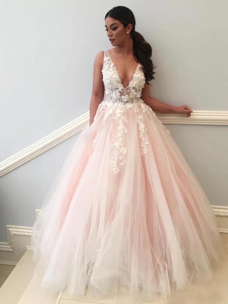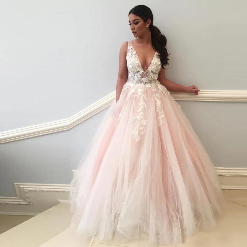 Sexy Deep V-Neck A-Line Pink Prom Dresses with 3D Lace Appliques Floral Prom Dresses See Through Plus Size Evening Gowns Custom Made