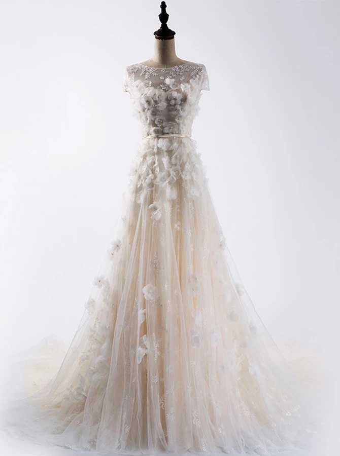 Exquisite Jewel Neck Floral Wedding Dresses with 3D Flowers Decoration Capped Sleeve Champagne Wedding Dresses Lace Beach Wedding Dress