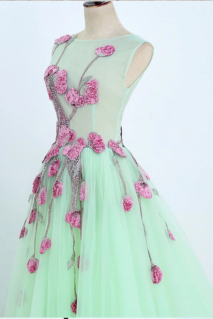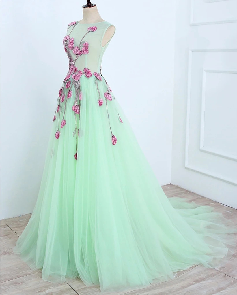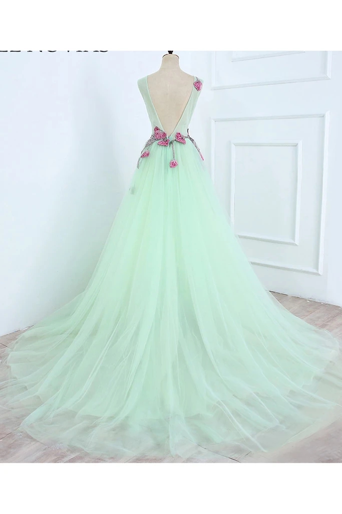 Exquisite A-Line Tulle Mint Green Prom Dress with Fuchsia 3D Appliques Floral Prom Dresses Beaded Low V Back Formal Evening Gowns
