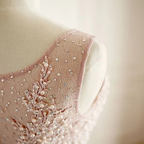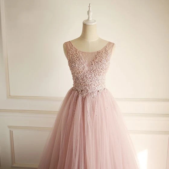 Chic Tulle A-Line Elegant Evening Dresses Online Lace Appliques Pearls Beading Pink Prom Dresses Sheer Back Formal Evening Gowns