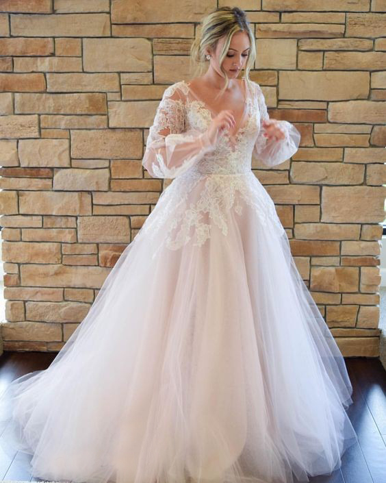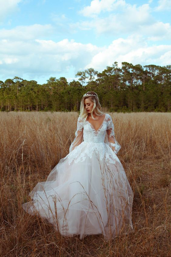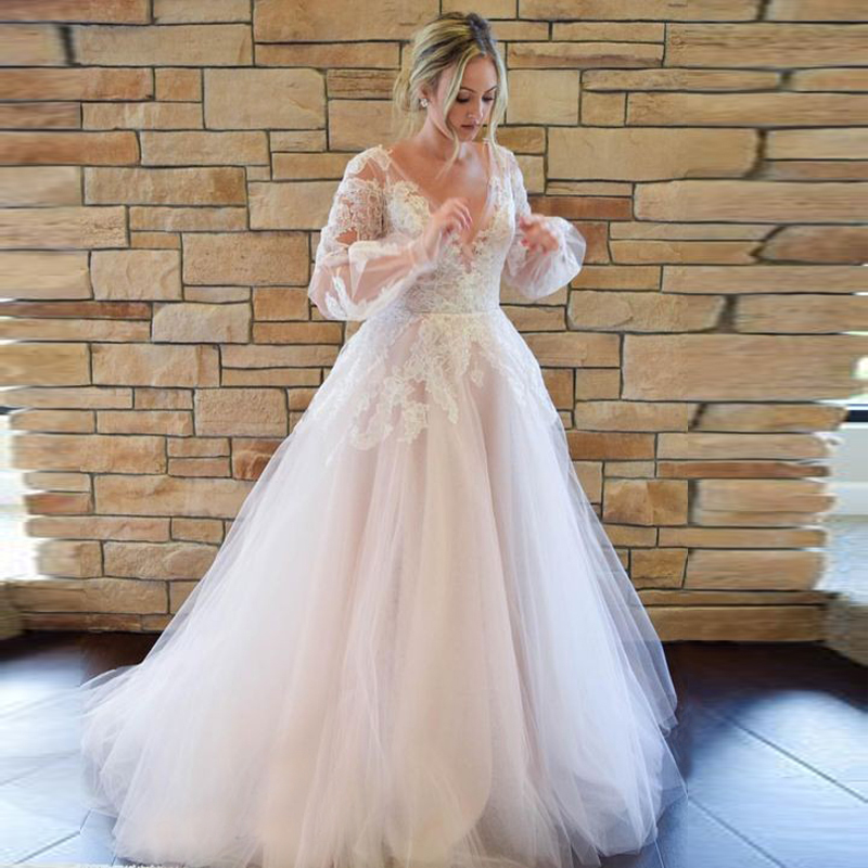 Romantic V-Neck A-Line Boho Wedding Dresses Lace Appliques Bell Long Sleeve Wedding Dresses with Sweep Train Plus Size Wedding Gowns