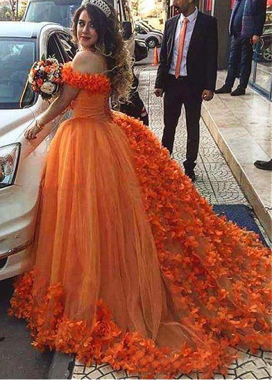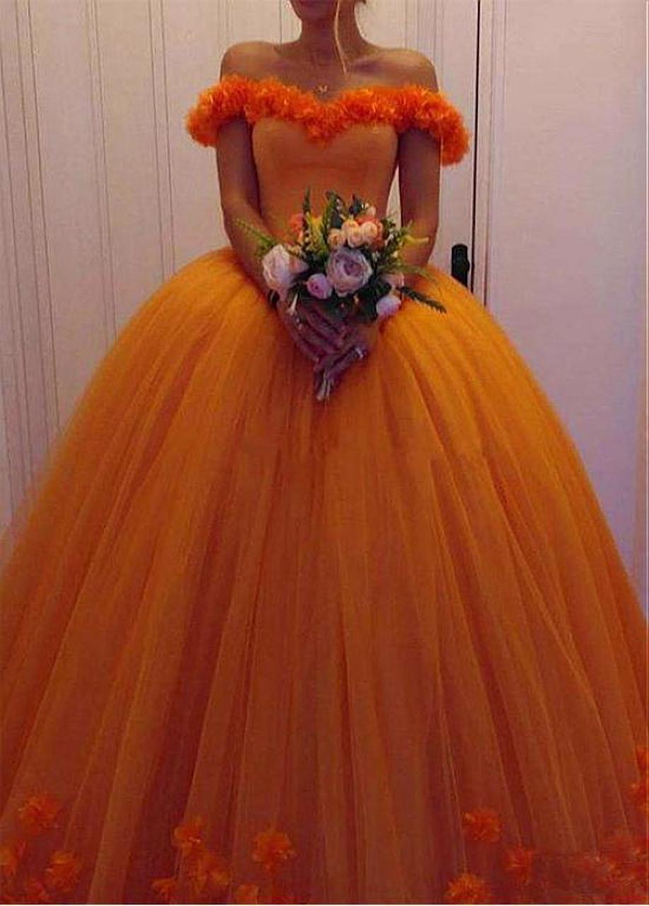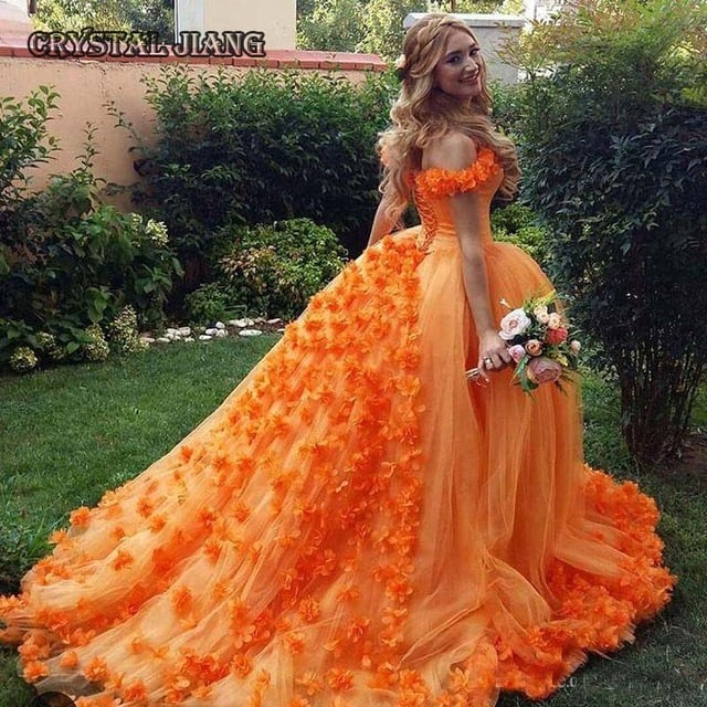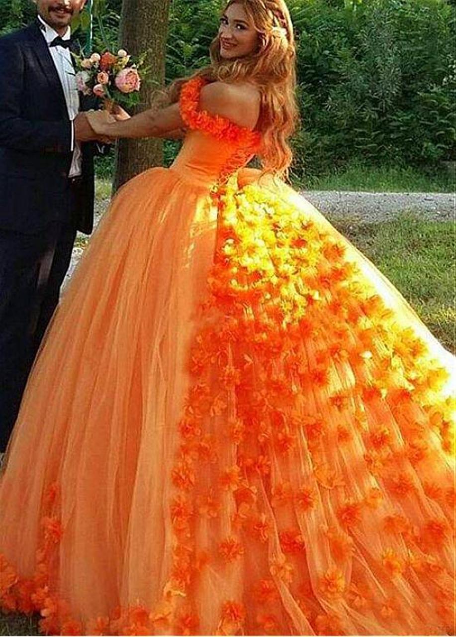 Unique Off-shoulder Puffy Orange Wedding Dresses with Handmade Flowers Ball Gown Wedding Dress Lace Up Back Princess Wedding Gowns