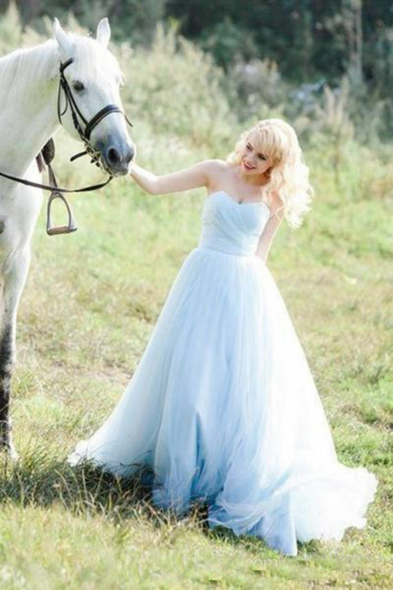 Beautiful Light Sky Blue A Line Wedding Dresses with Sweep Train Chic Strapless Country Wedding Dresses Simple Tiered Lace Wedding Dress