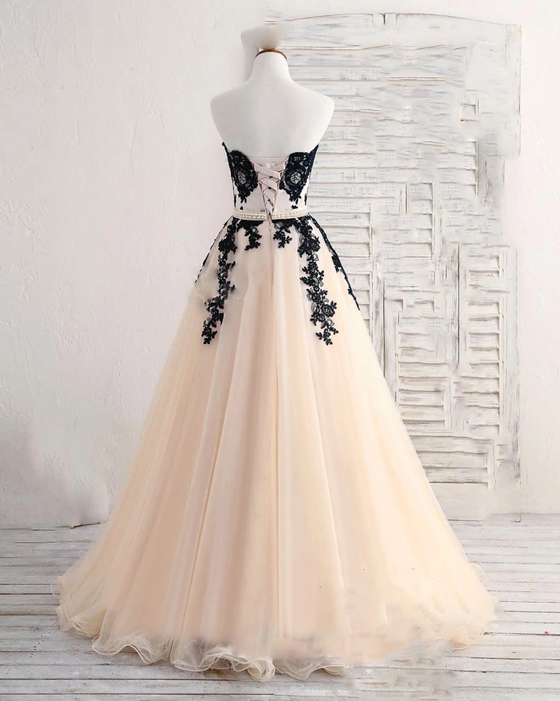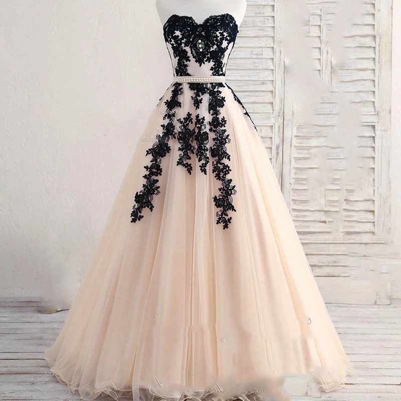 Romantic Strapless Champagne Wedding Dresses Pearls Beaded Black Lace Appliques Boho Wedding Dresses Black Appliques Pretty Wedding Dresses