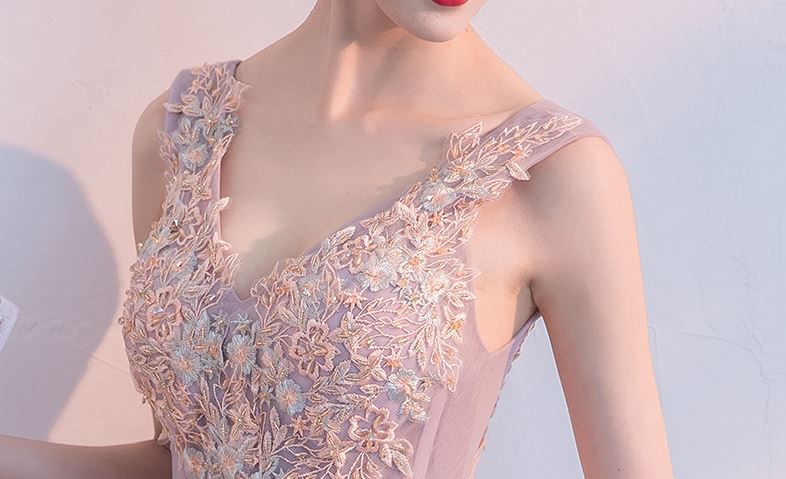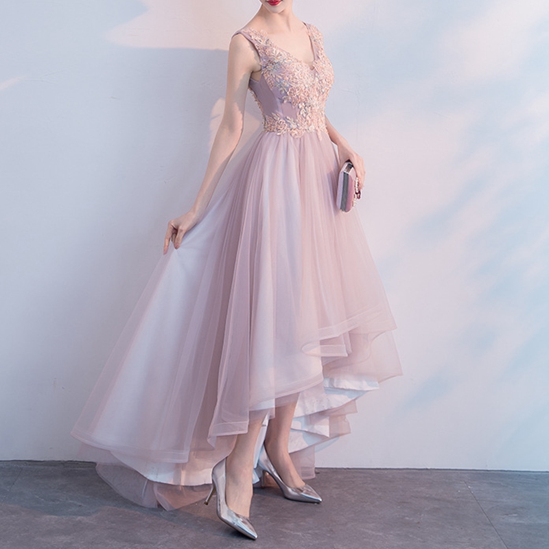 Sweet V-Neck A-Line Pink Prom Dresses Delicate Lace Appliques High Low Prom Dresses Lace Up Back Petite Formal Dresses for Engagement Dinner
