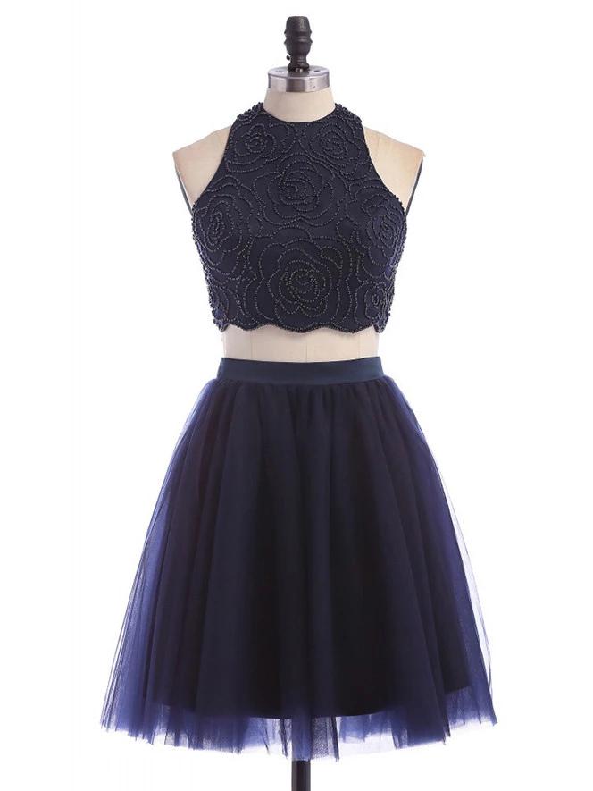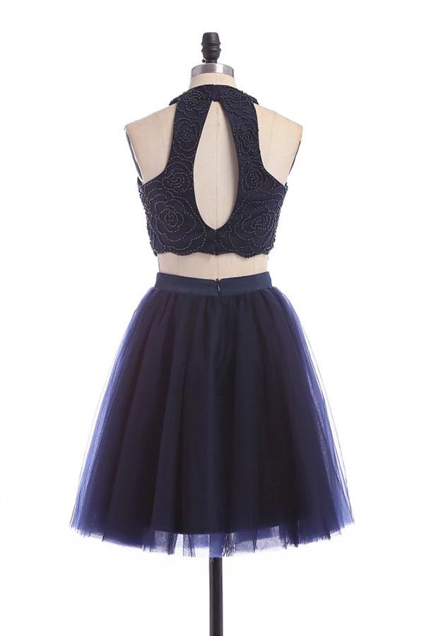 Chic Jewel Neck Two Piece Homecoming Dress Patterns Beading Navy Prom Dresses Short Open Back Sexy Party Dresses