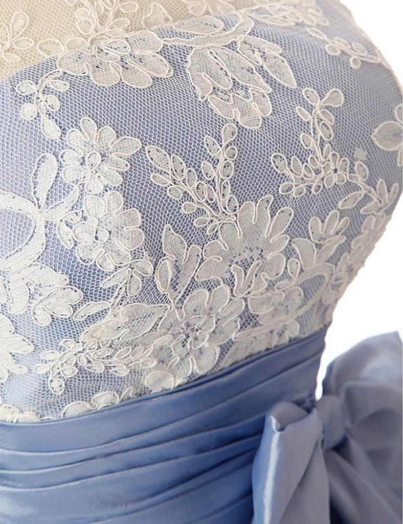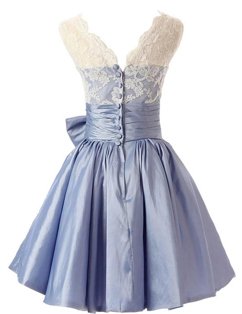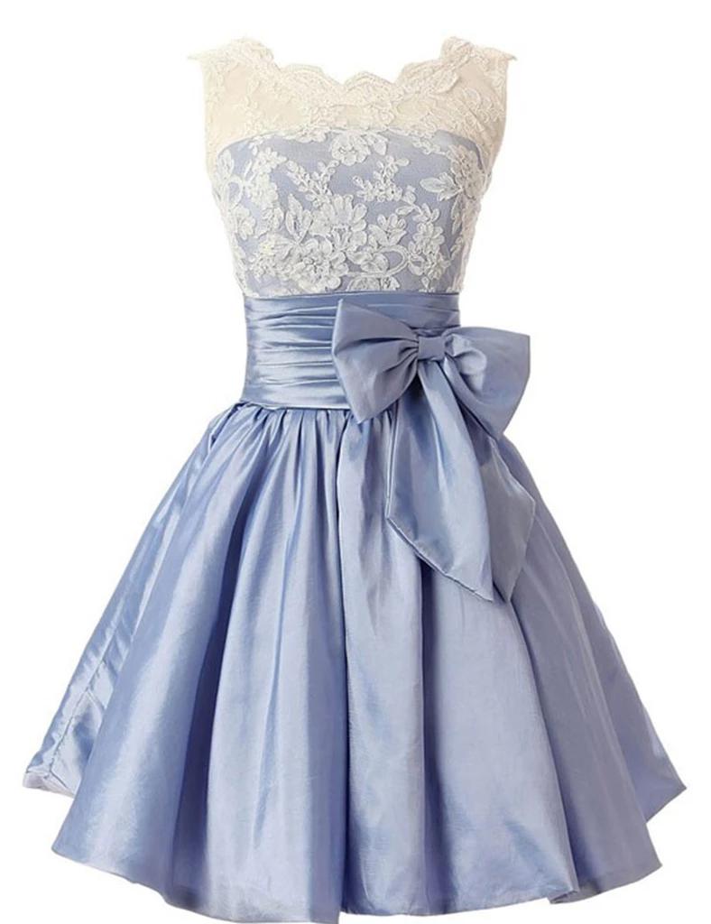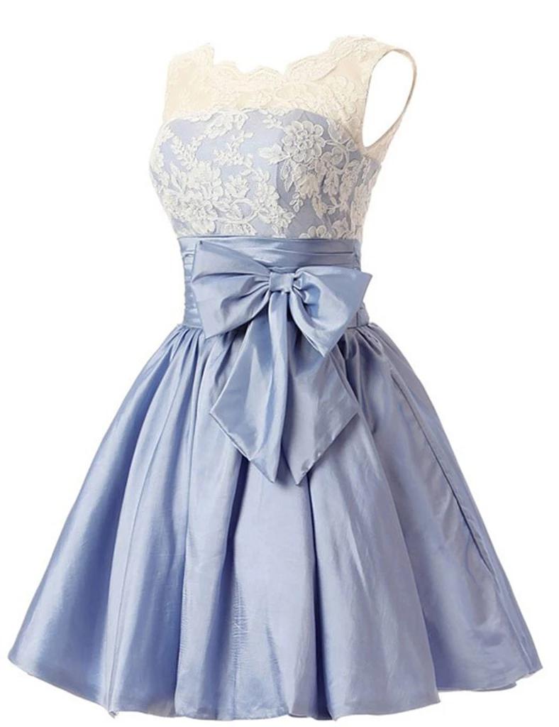 Chic Scoop A-Line Blue Short Prom Dresses Lace Appliques Bodice Simple Homecoming Dresses with Big Bow Cute Party Dresses