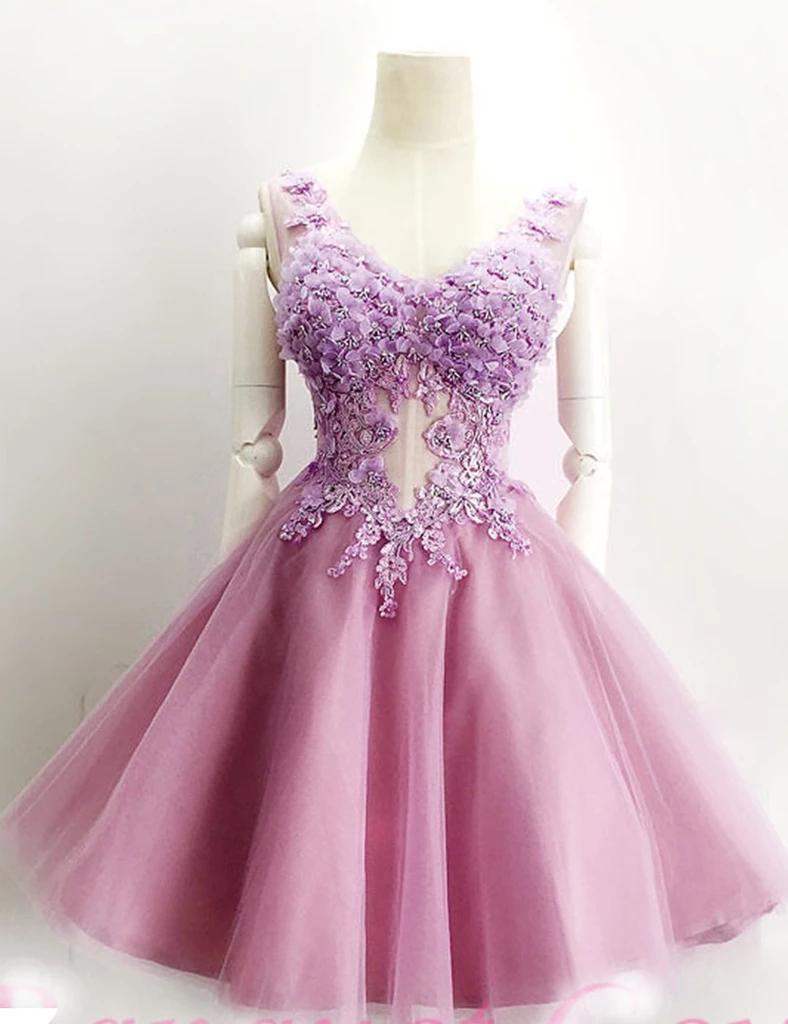 Pretty V-Neck Sleeveless Floral Prom Dresses A-Line Lace Appliques with 3D Flowers Purple Homecoming Dresses Lace Up Back Party Dresses for Juniors