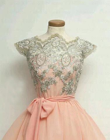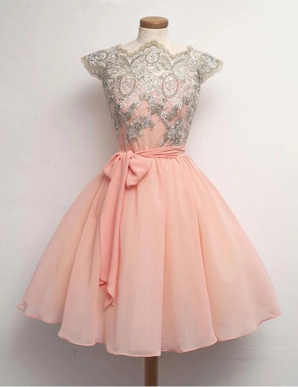 Sweet Scoop Neckline Pink Homecoming Dresses Chiffon A-Line Lace Appliques Cap Sleeve Prom Dress Sash Bodice Short Party Dresses