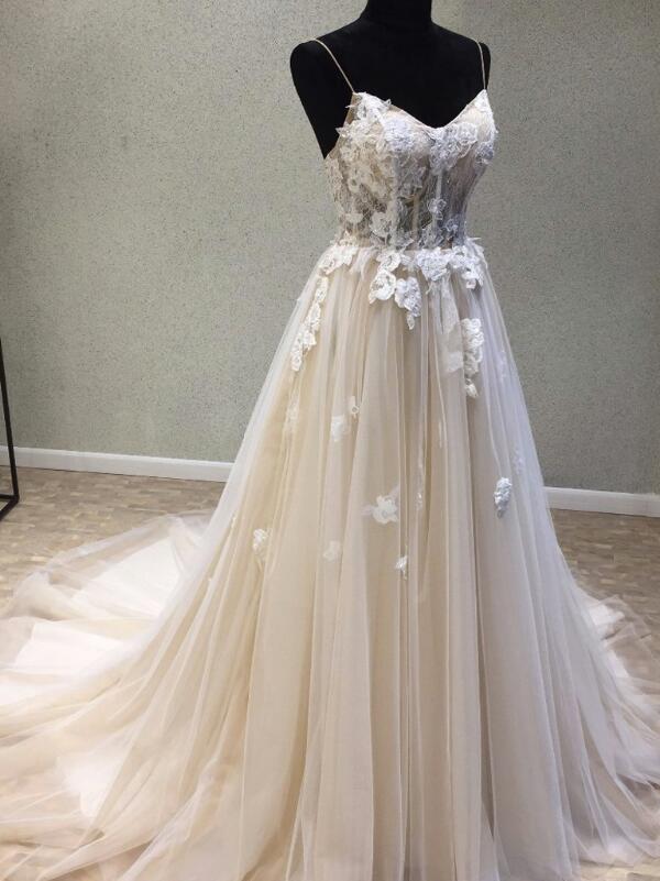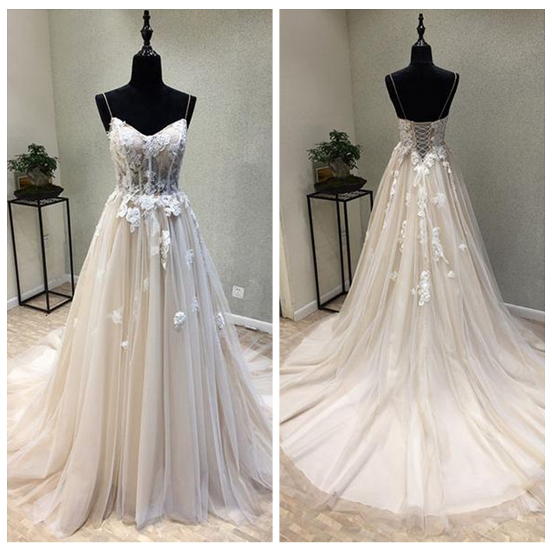 Floral Tulle A-Line Spaghetti Strap Wedding Dress Embroidery Lace Appliques Beach Wedding Dresses Lace Up Back Cheap Wedding Gowns Plus Size