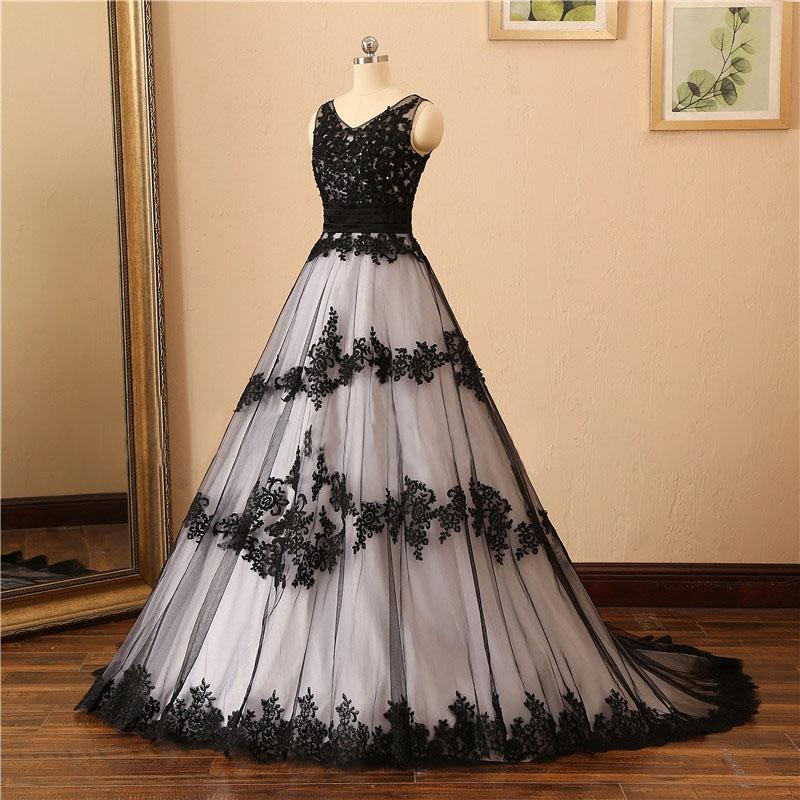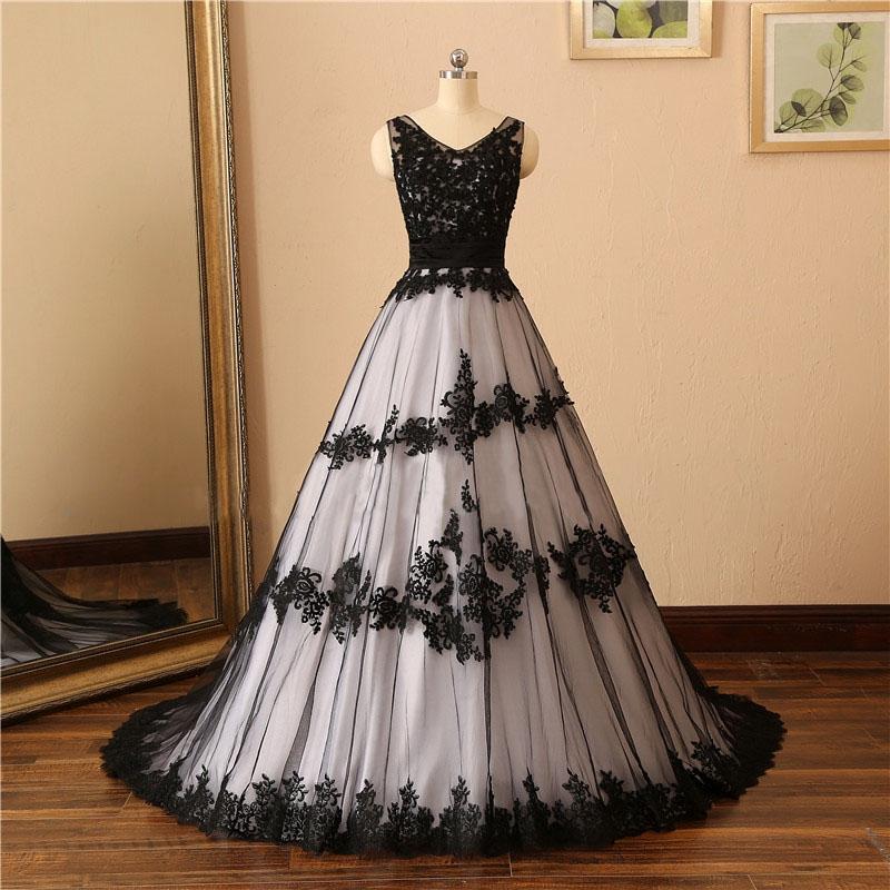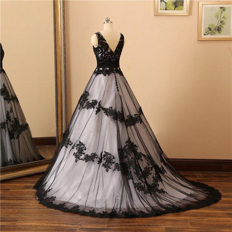 Exquisite V-Neck Lace Appliques Black White Wedding Dress Elegant Gothic Wedding Dress with Sequins and Sweep Train Vestido De Noiva