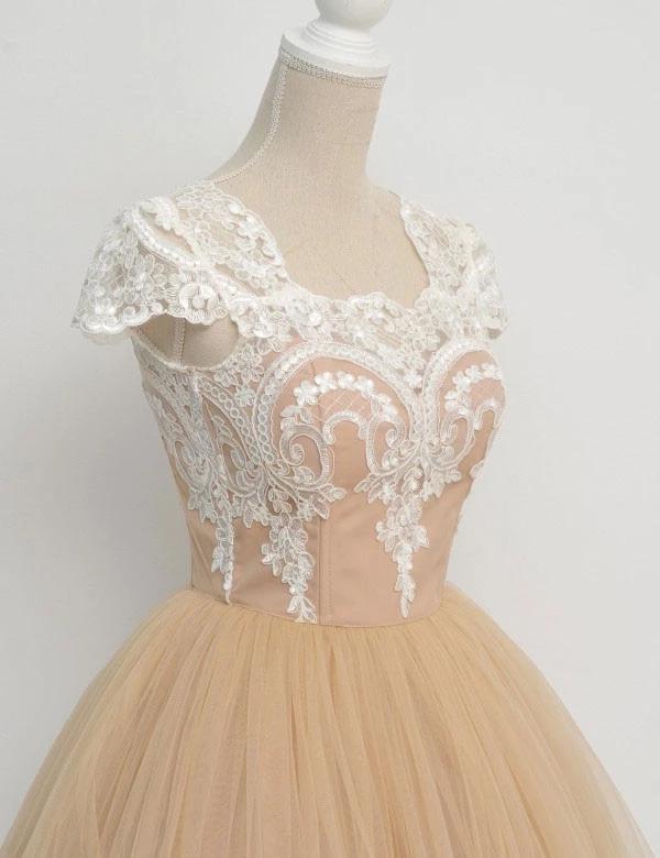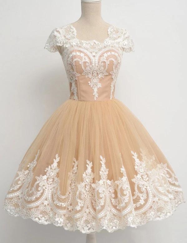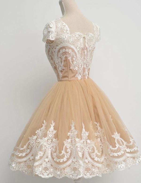 Chic Square Neckline Champagne Homecoming Dresses with Cap Sleeves Lace Appliques Vintage Prom Dress Short Zipper Up Back Cute Party Dresses