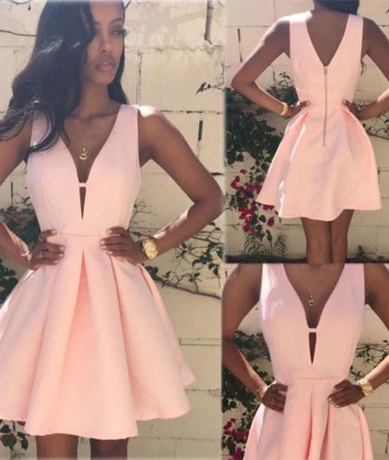 V-Neck Sleeveless Satin Pink Short Mini Lady Dresses for Party A-Line Pretty Dresses for Prom Zipper Up Back Simple Formal Dresses