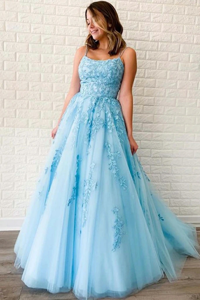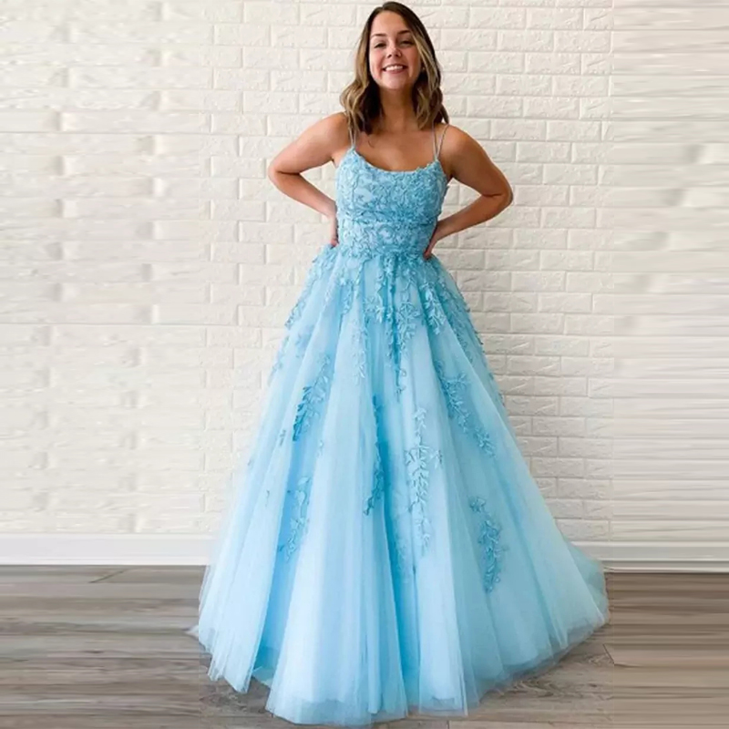 Chic Spaghetti Straps Blue Prom Dress A-Line Lace Appliques Graduation Dresses with Sweep Train Criss Cross Straps Cheap Homecoming Dresses