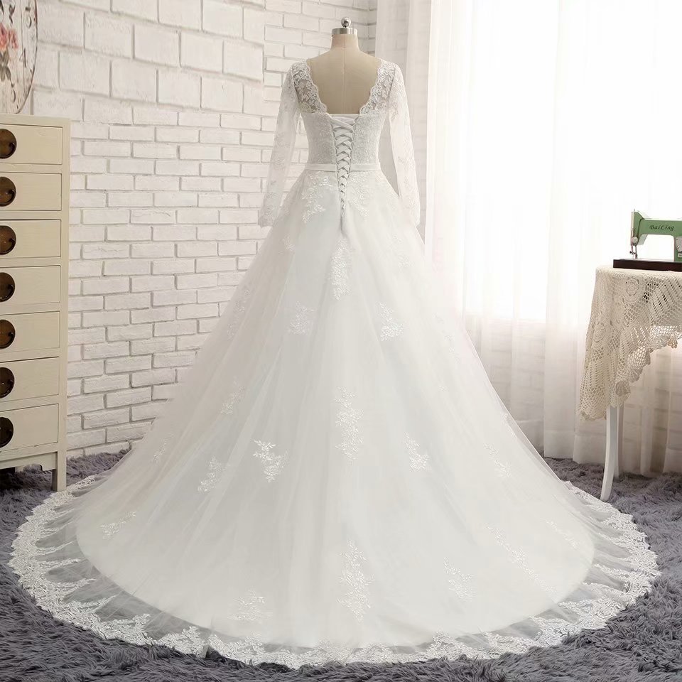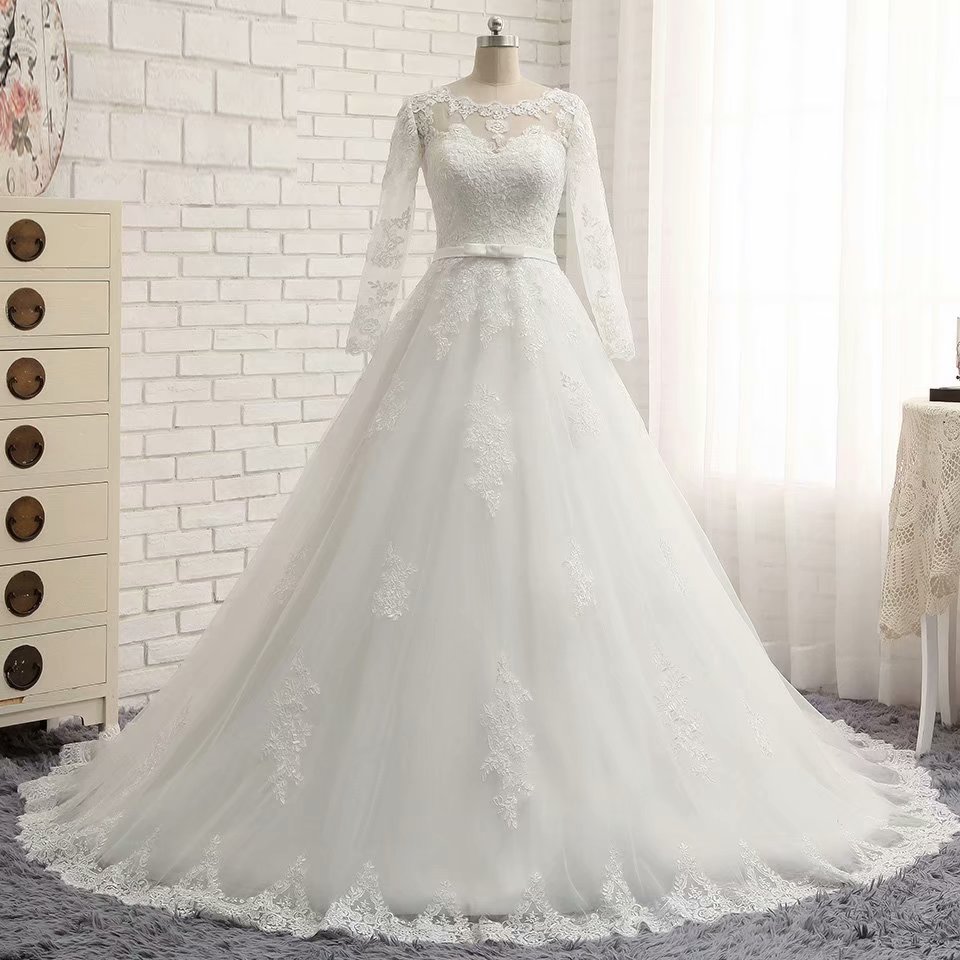 Classy Long Sleeve Wedding Dresses Scoop A-Line White Tulle Country Bridal Dress Lace Appliques Bodice Wedding Gowns for Older Brides