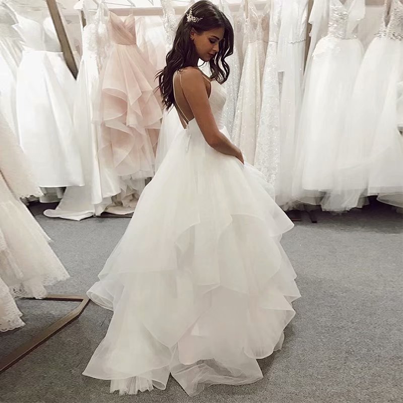 Romantic Bridal Dresses Spaghetti Straps Cheap Beach Wedding Dresses with Ruffle Skirt Backless Wedding Dress Sweep Train vestidos de noche