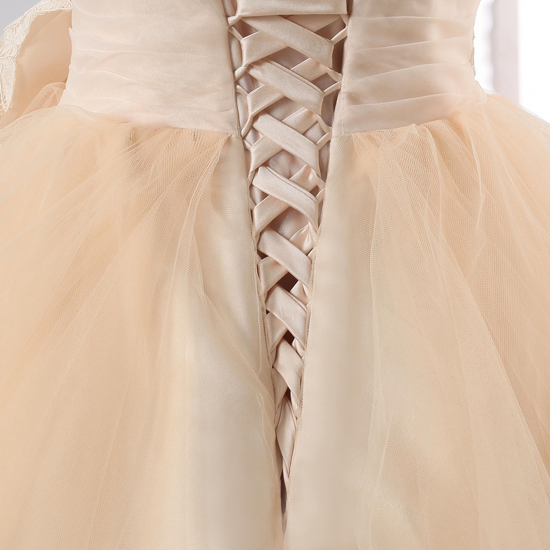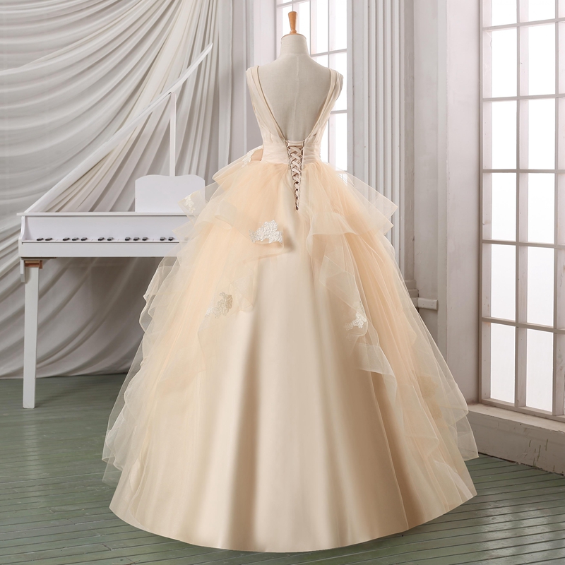 Elegant V-Neck Tulle Champagne Wedding Dresses with Ruffle Skirt Colored Wedding Dresses Appliques Lace Up Back Unique Wedding Gowns