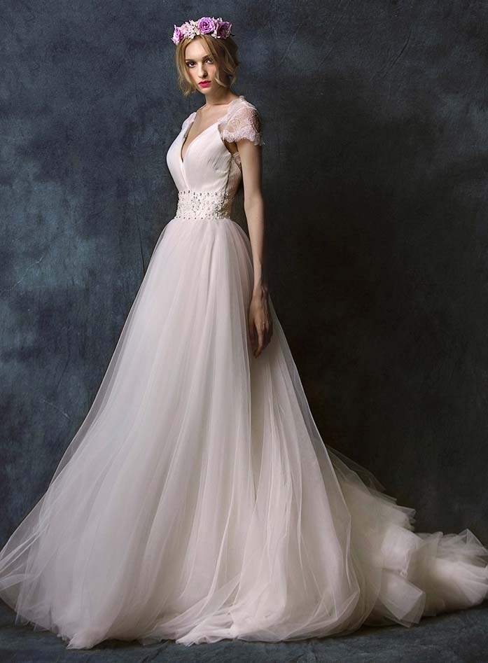 Romantic Wedding Dresses with Sleeves A-Line Tulle Custom Wedding Dress Beaded Waist Sheer Back Cheap Wedding Gowns voiles de mariage