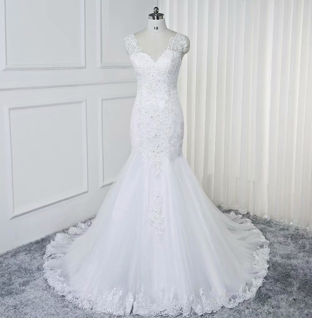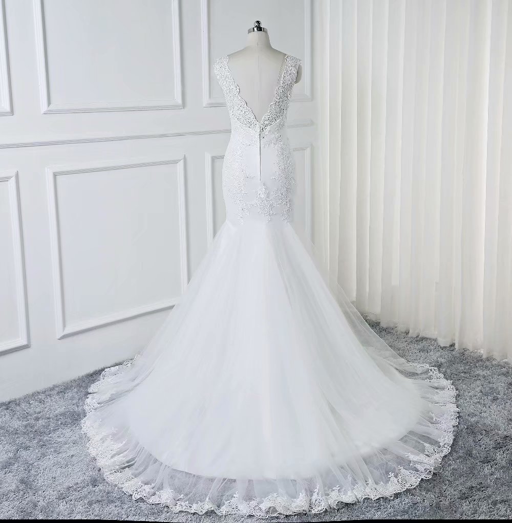 Dreaming V-Neck Mermaid Wedding Dress Sexy White Beaded Backless Wedding Dresses Sweet Lace Appliques Bridal Dresses with Sweep Train