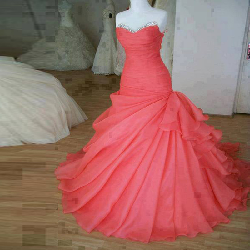 Sexy Strapless Mermaid Wedding Dress with Beaded Neck Ruffle Organza Wedding Dresses Illusion Bodice Red Wedding Dresses with Sweep Train