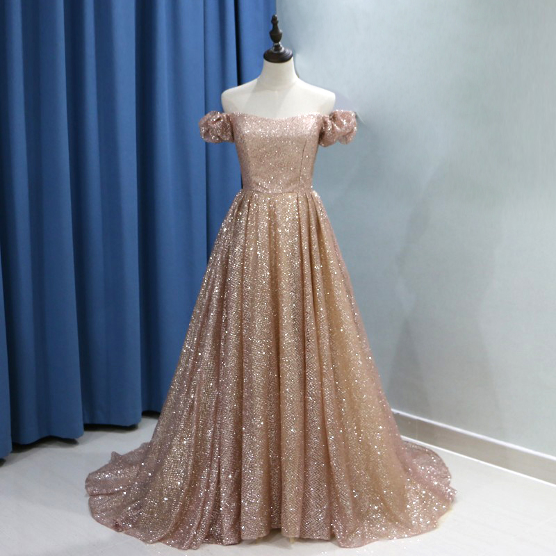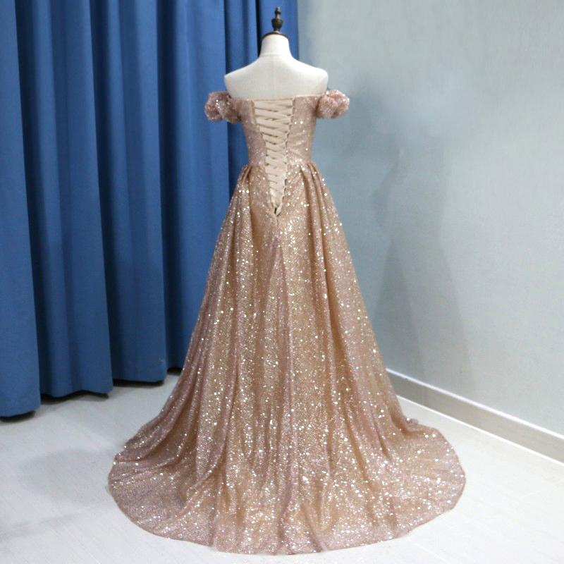 Shining Off the Shoulder Champagne Prom Dresses Chic Mading A Line Evening Gowns Exquisite Lace Up Long Prom Dresses with Sweep Train