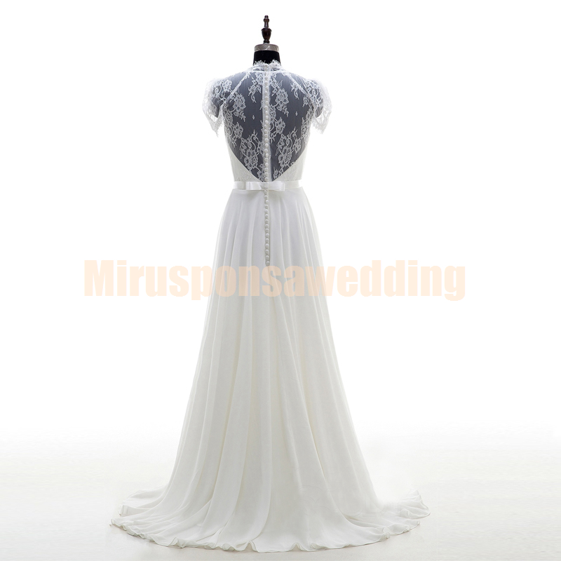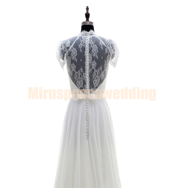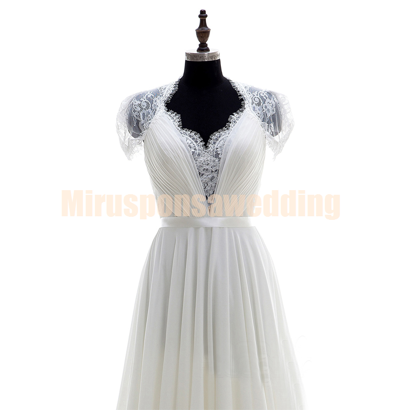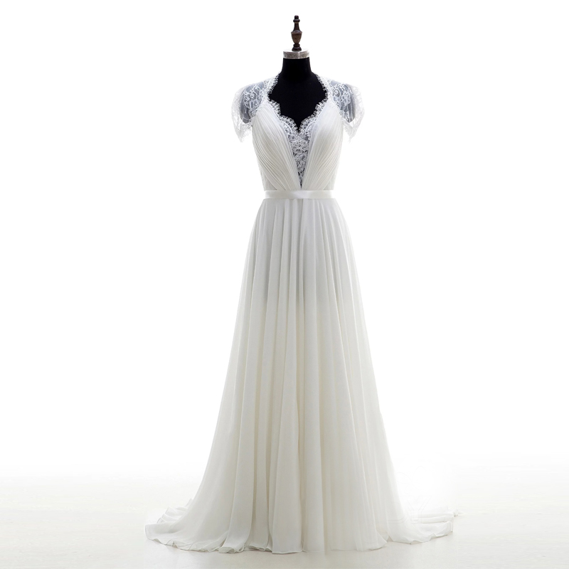 Romantic V-Neck White Beach Wedding Dresses Online A-Line Lace Appliques Wedding Dresses with Sleeves Sheer Back Cheap Bridal Gowns