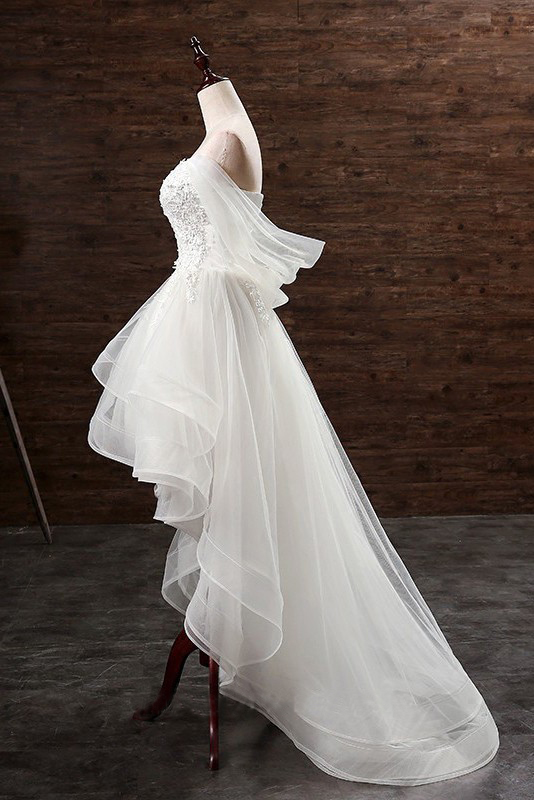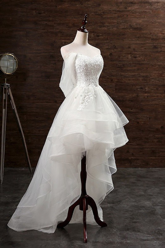 Chic Strapless White Organza High Low Wedding Dresses Lace Appliques Beach Wedding Dresses with Shawl Asymmetrical Wedding Dresses