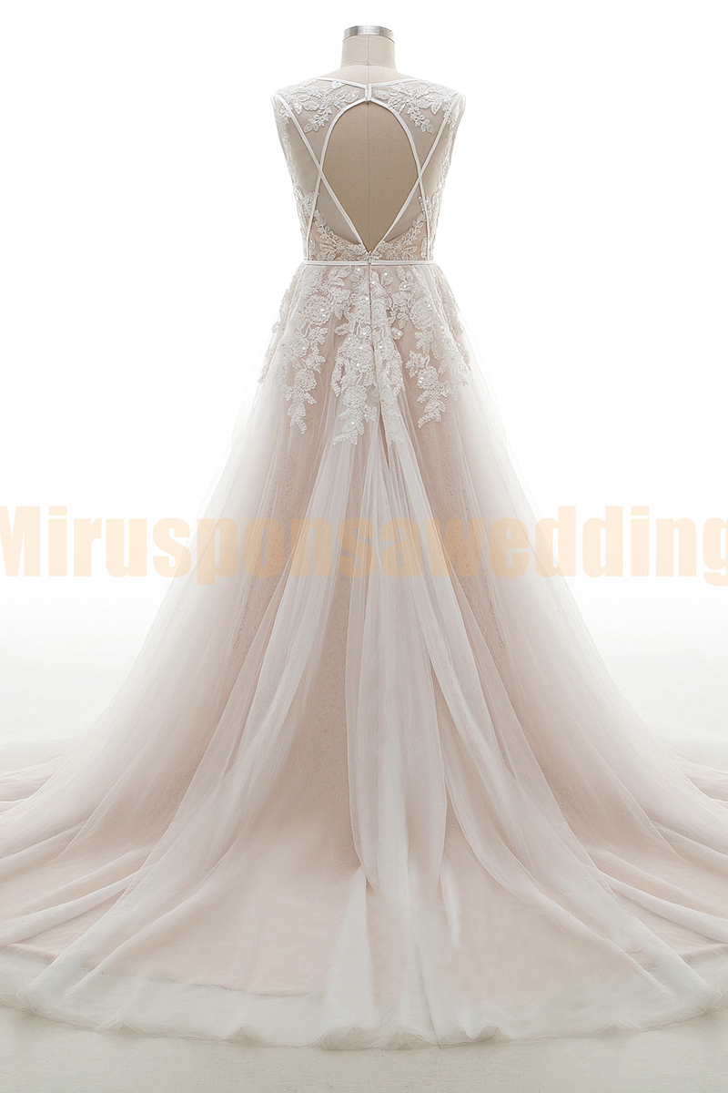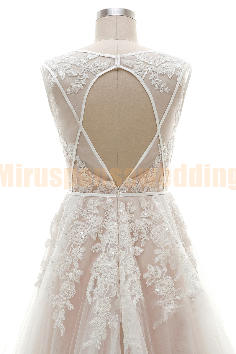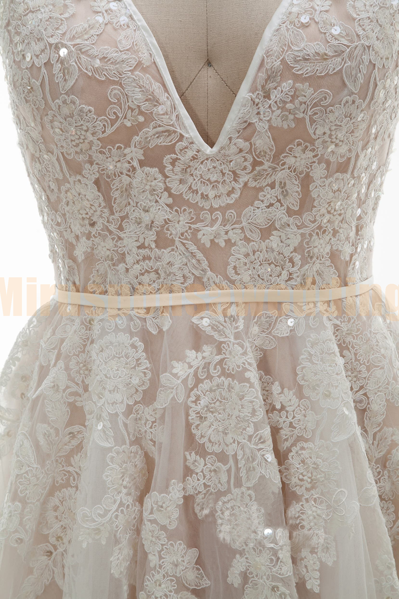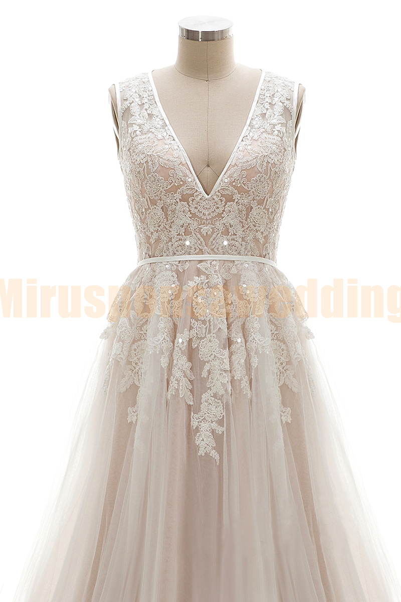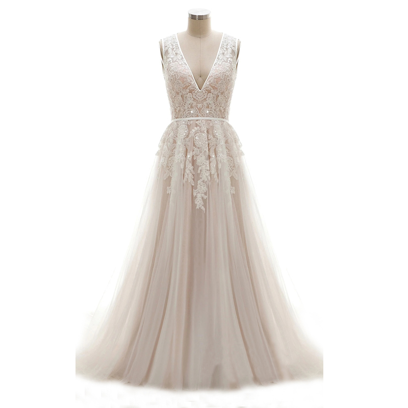 Bridal Dresses Deep V-Neck Tulle Champagne Romantic Wedding Dresses for Sale A-Line Lace Appliques Sash Bodice Wedding Dresses for Bride