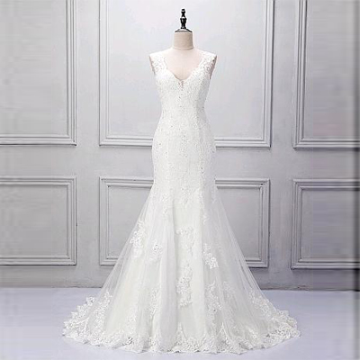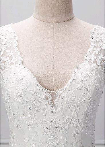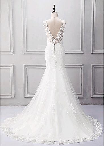 Simple V-Neck White Mermaid Wedding Dresses Cheap Lace Appliques Plunging Back Bridal Dresses Wedding Gowns vestidos cortos de fiesta