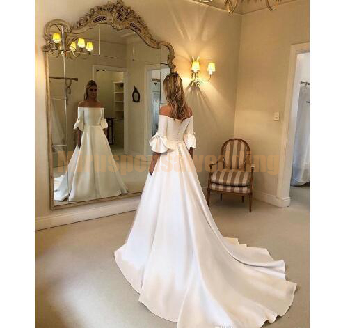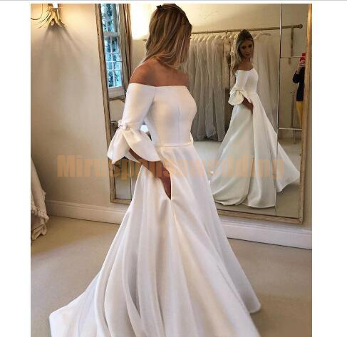 Off Shoulder White Ivory Wedding Dress A-line American Bridal Gowns 2020 New Arrival Chapel Train Simple Satin Brazilian Vestido De Novia