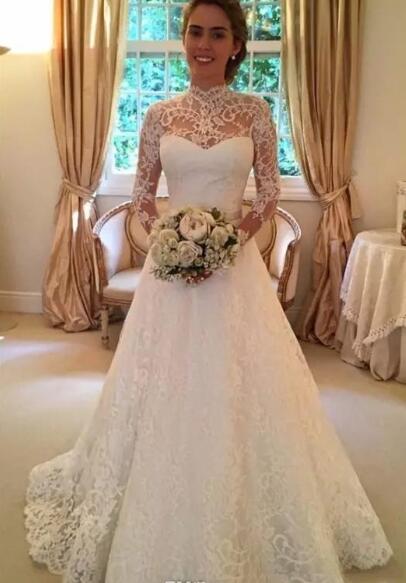 Modest High Neck Long Sleeve Full Lace Wedding Dresses Sexy Backless floor Length Sash Ribbon Custom Made Lace Bridal Gown voiles de mariage