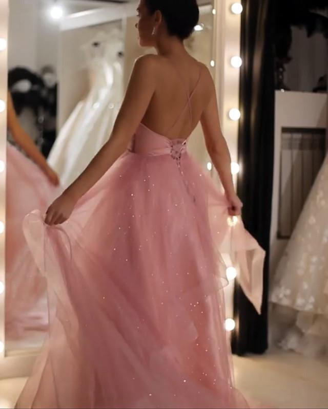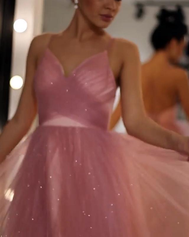 Spaghetti Straps Pink Prom Dress Tiered Tulle Formal Dresses Women with Criss-Cross Back Vestido De Festa