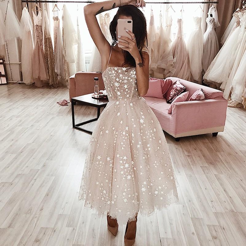 Sparkly Prom Dresses with Straps Star Lace Tea-length Prom Dress Fashion Evening Dress Zipper Up Back robes de cocktail