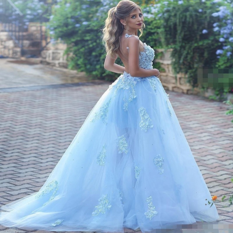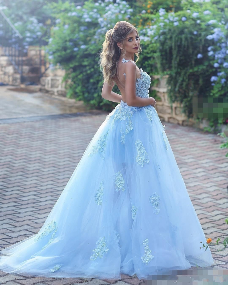 Light Blue Wedding Dress A-Line Illusion Neckline Lace Appliques Pearls Beaded vestidos de noiva Sheer Back Wedding Gowns