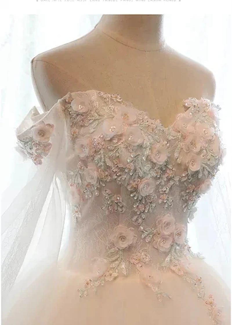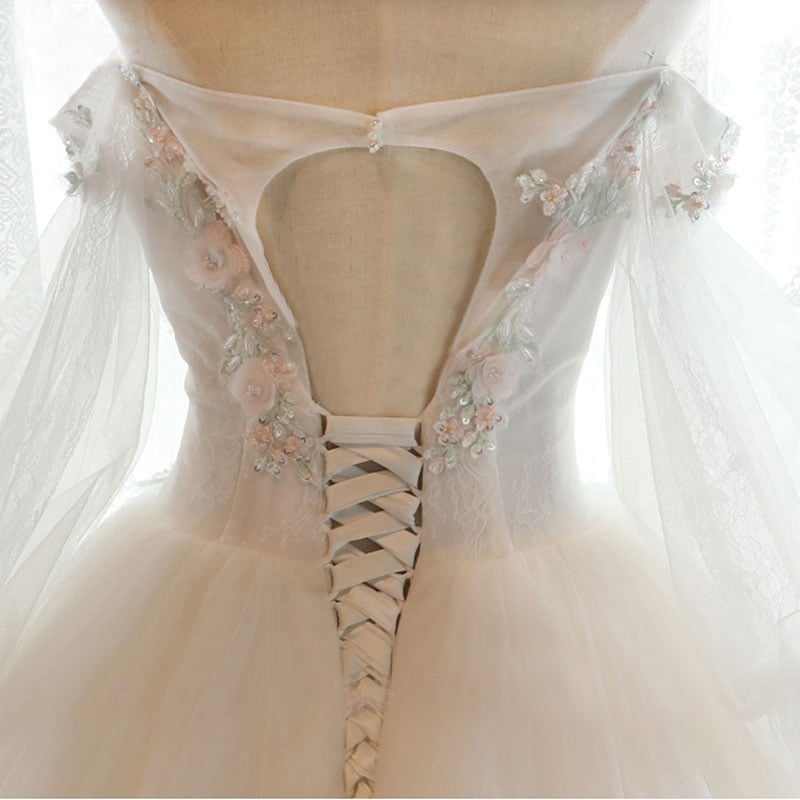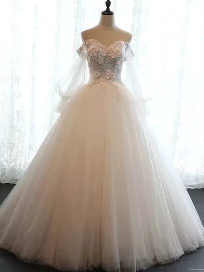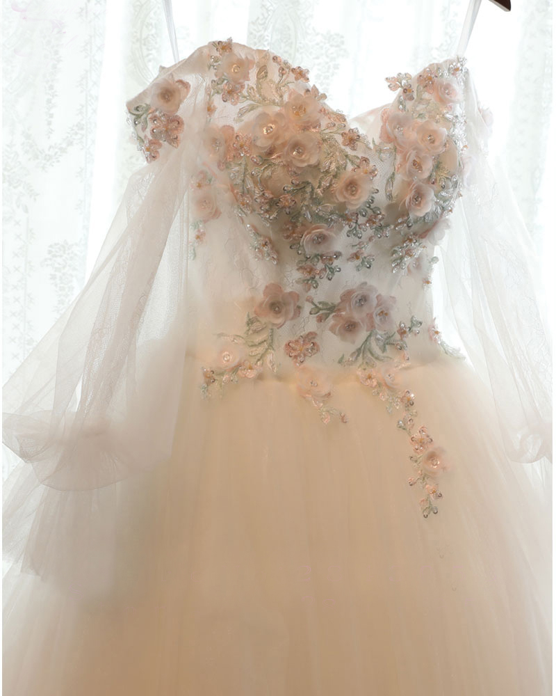 White Tulle Floral Wedding Dresses with Long Sleeve Ball Gown Lace Applique Off-Shoulder vestido de noiva 3D Flowers Bride Dress