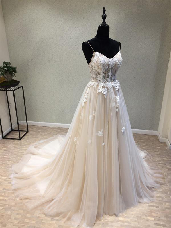 Beautiful Wedding Dresses A-line Brush Train Spaghetti Straps Long Sexy Lace Bridal Gown with 3D Flowers robe mariage femme