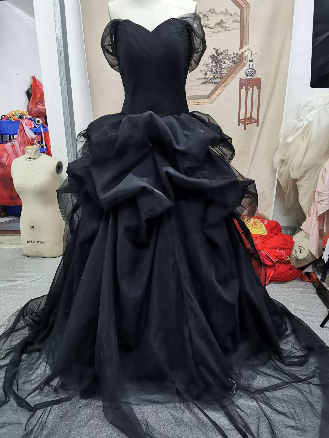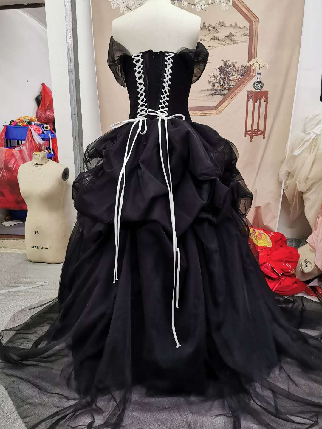Off-the-shoulder Gothic Wedding Dresses with Ruffles Skirt Black Wedding Dress Ball Gown Lace Up Back Bridal Dresses