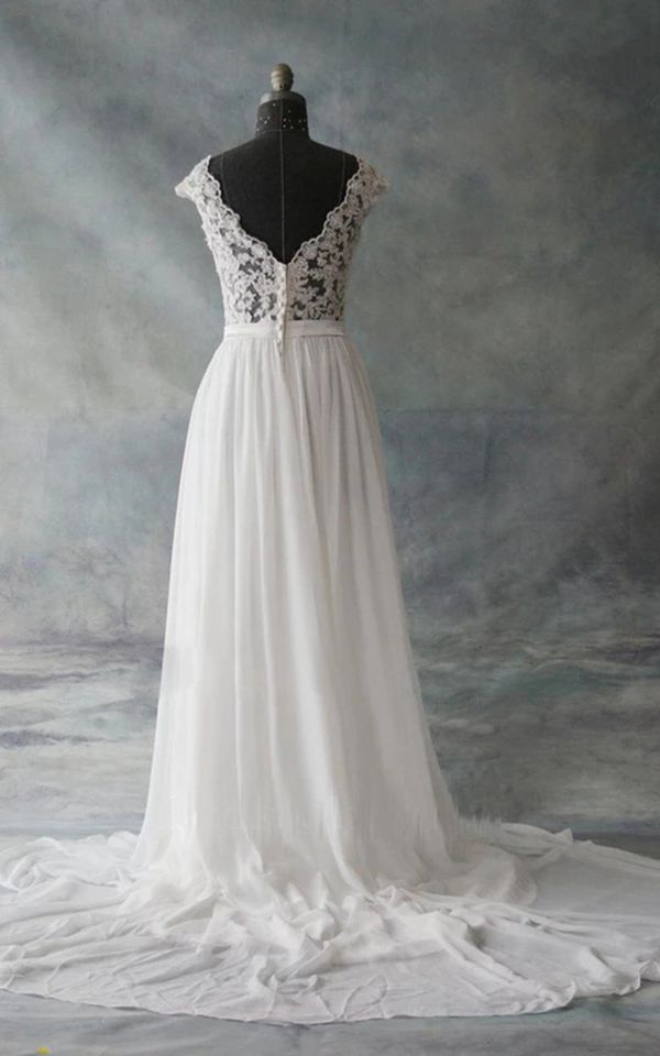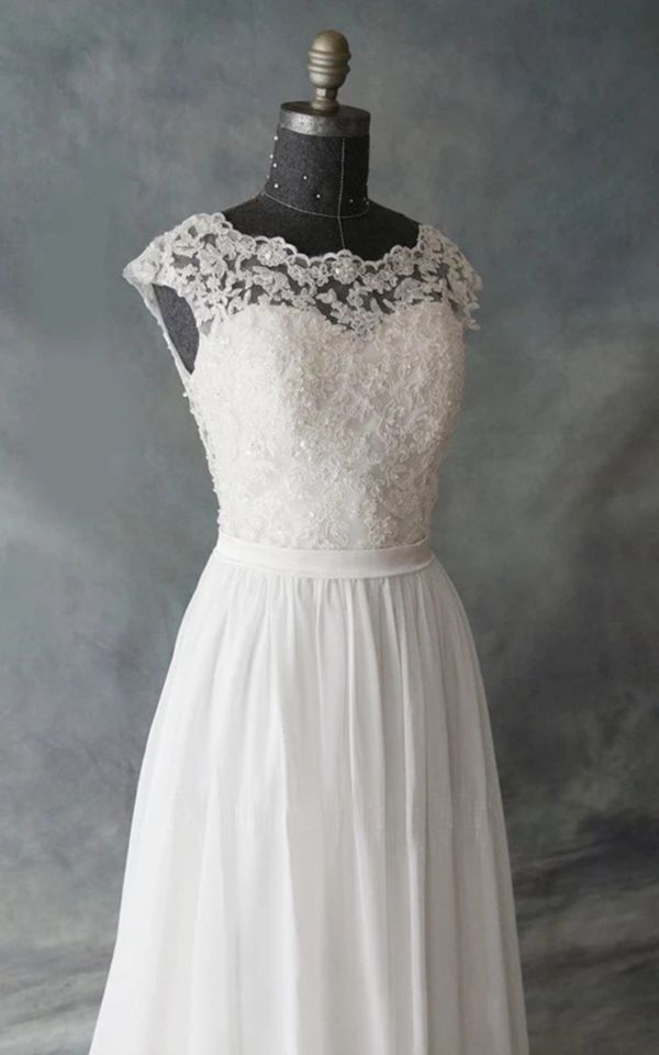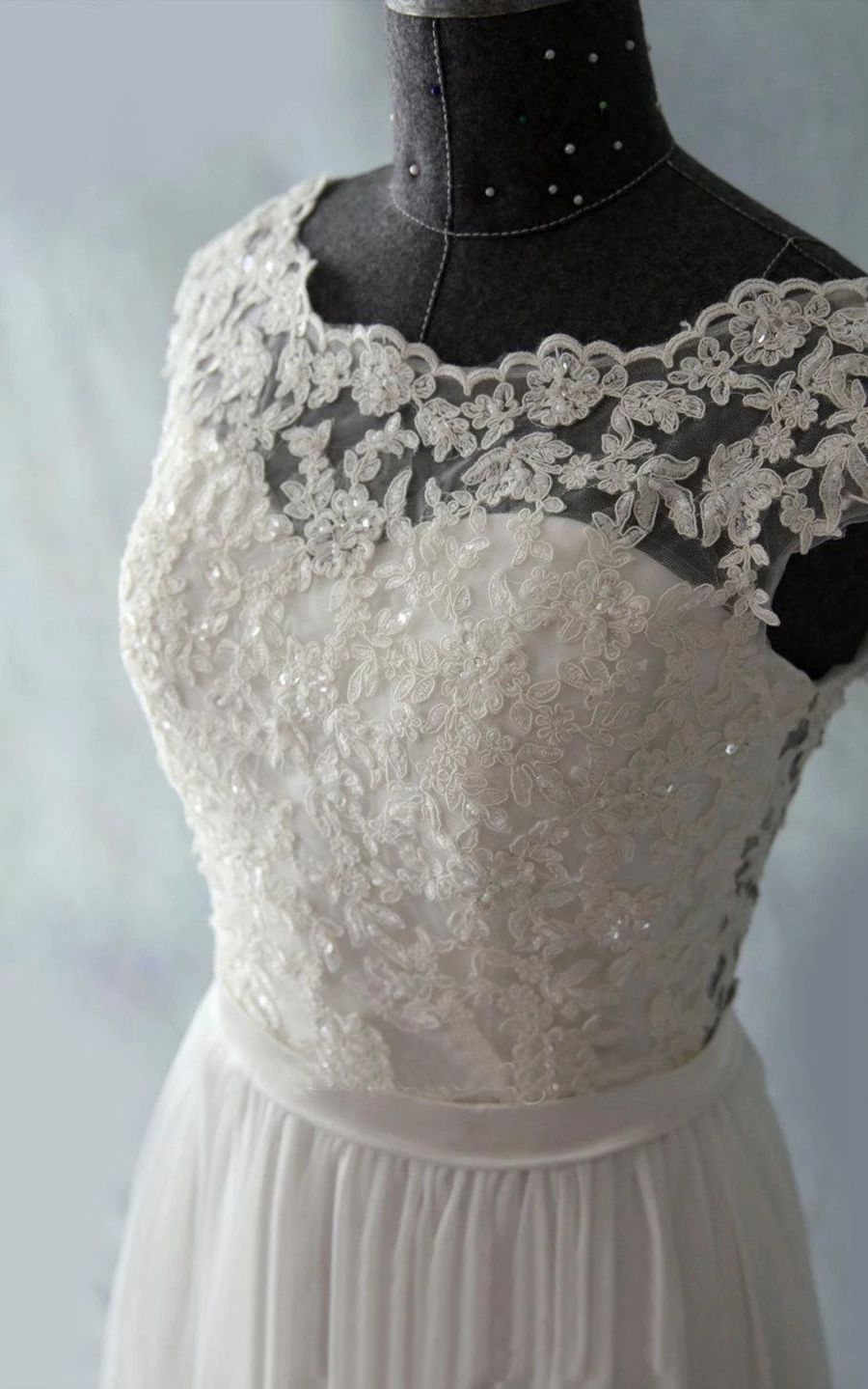 White Cap Sleeve A Line Wedding Dresses Chiffon Lace vestidos de novia Appliques Pearls Beaded Low Back wedding gowns Bride Dress