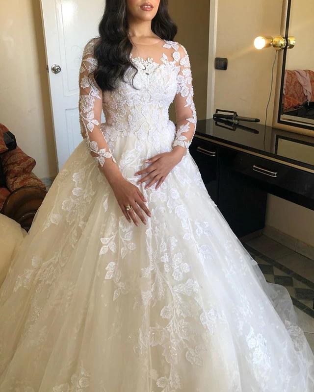Illusion Neck Long Sleeve Lace Ball Gown Wedding Dresses