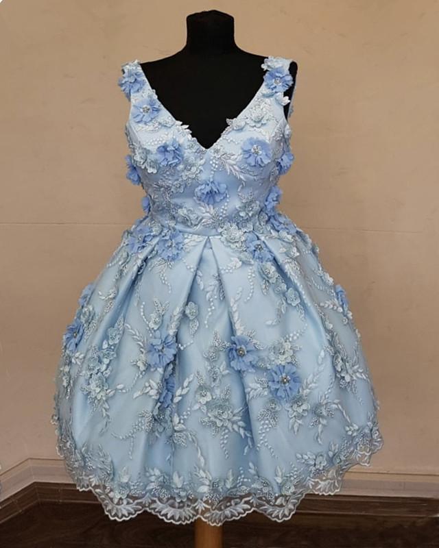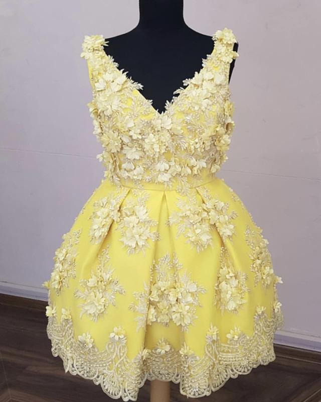 Cute V Neck Yellow Homecoming Dresses With 3D Lace Flower Embroidery, Debs Prom Dresses, Short Party Dresses