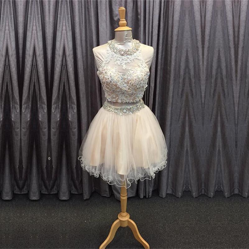 Light Champagne Tulle Beaded Two Piece Homecoming Dress, Cute Party Dresses, Semi Formal Dresses