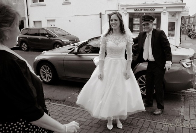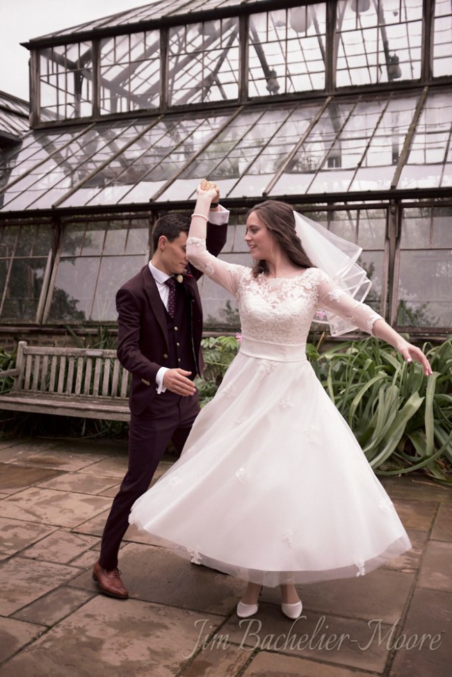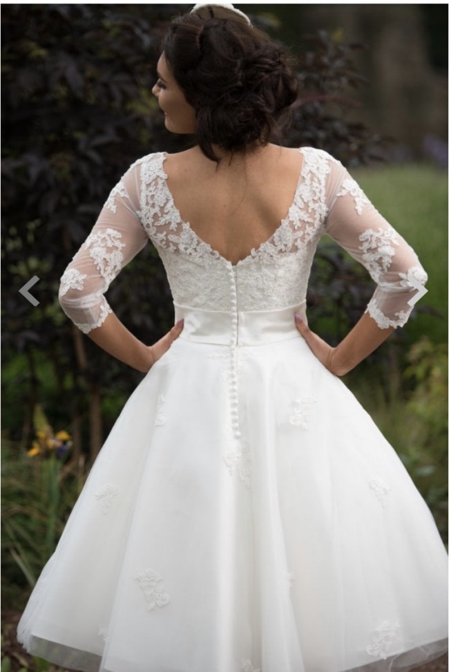White Tea Length Wedding Dresses Lace Appliques with 3/4 Sleeves