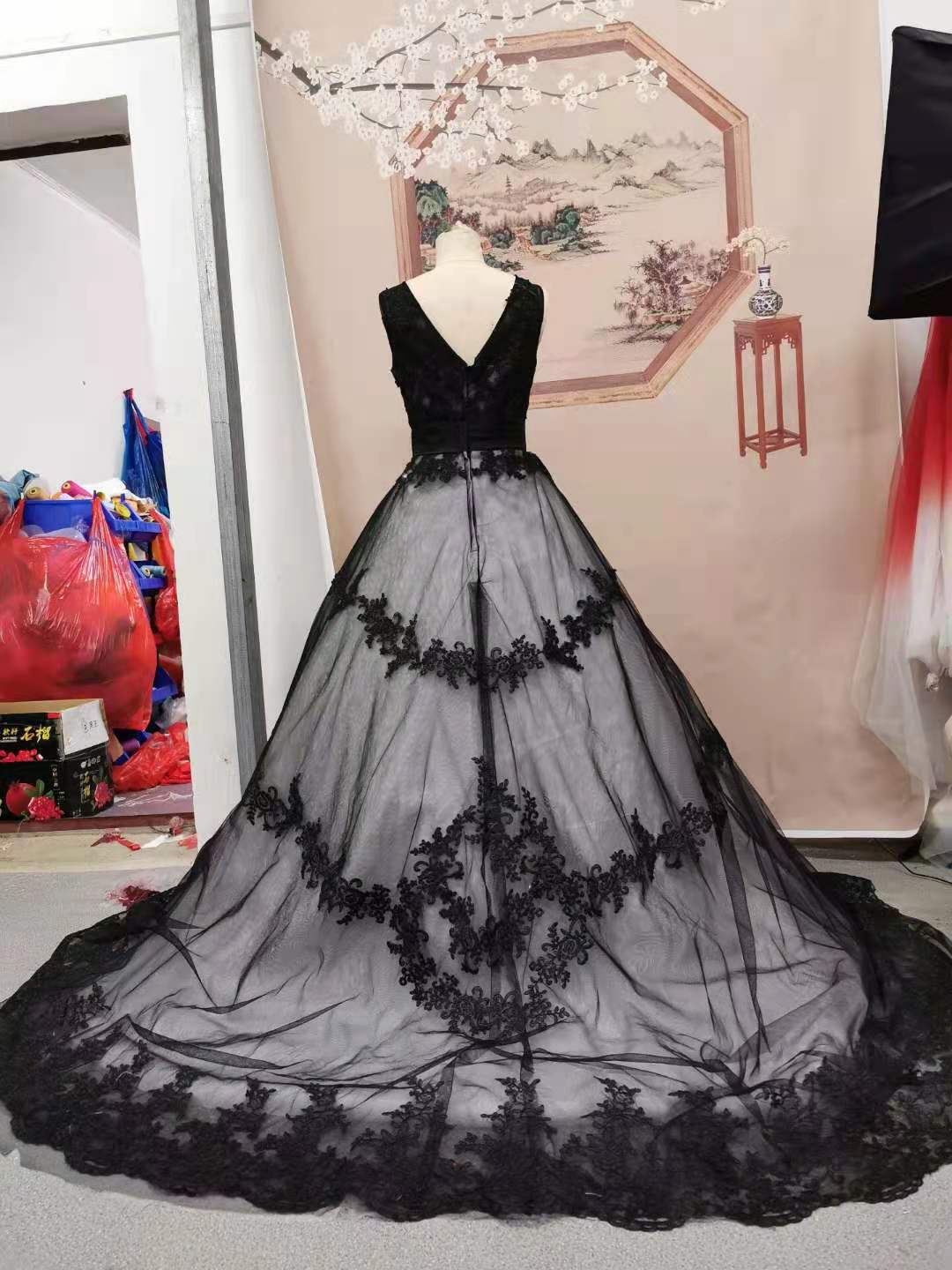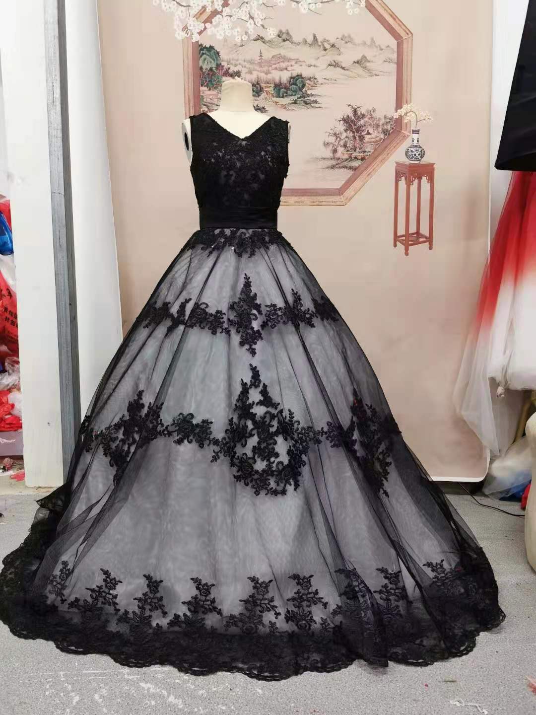 Real Photos V-Neck Lace Appliques Black White Wedding Dress Elegant Gothic Wedding Dress with Sequins and Sweep Train Vestido De Noiva