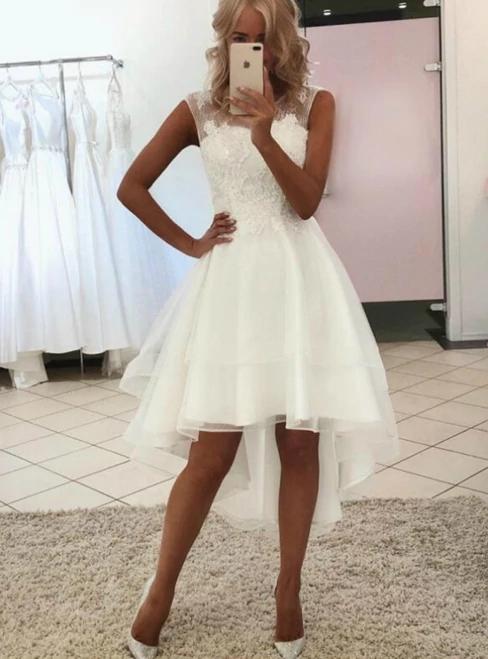 White Sleeveless A-Line High Low Wedding Dresses with Beaded Lace Appliques Simple Bridal Gowns