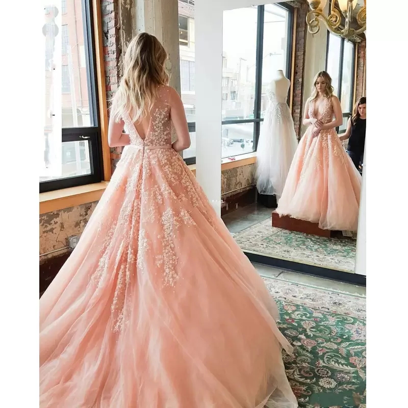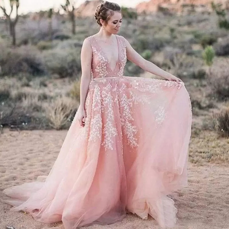 Tulle Blush Wedding Dress Ball Gown Deep V-Neck Lace Appliques vestido de novia Pearls Beaded Bridal Dresses Custom Made