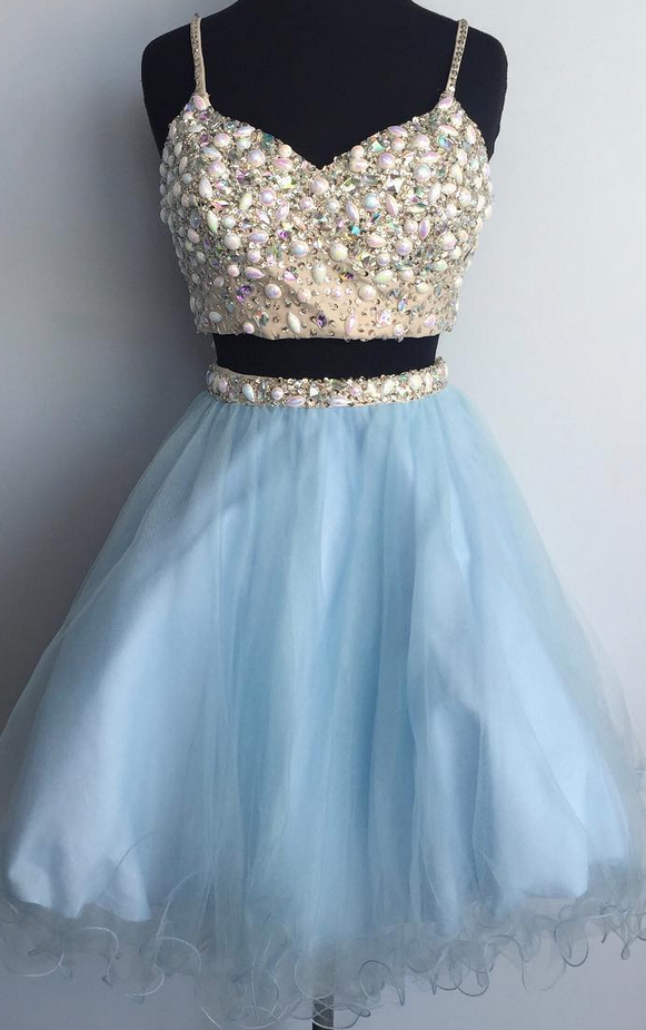Baby Blue Two PiecesHomecoming Dress, Beadings Tulle Homecoming Dress