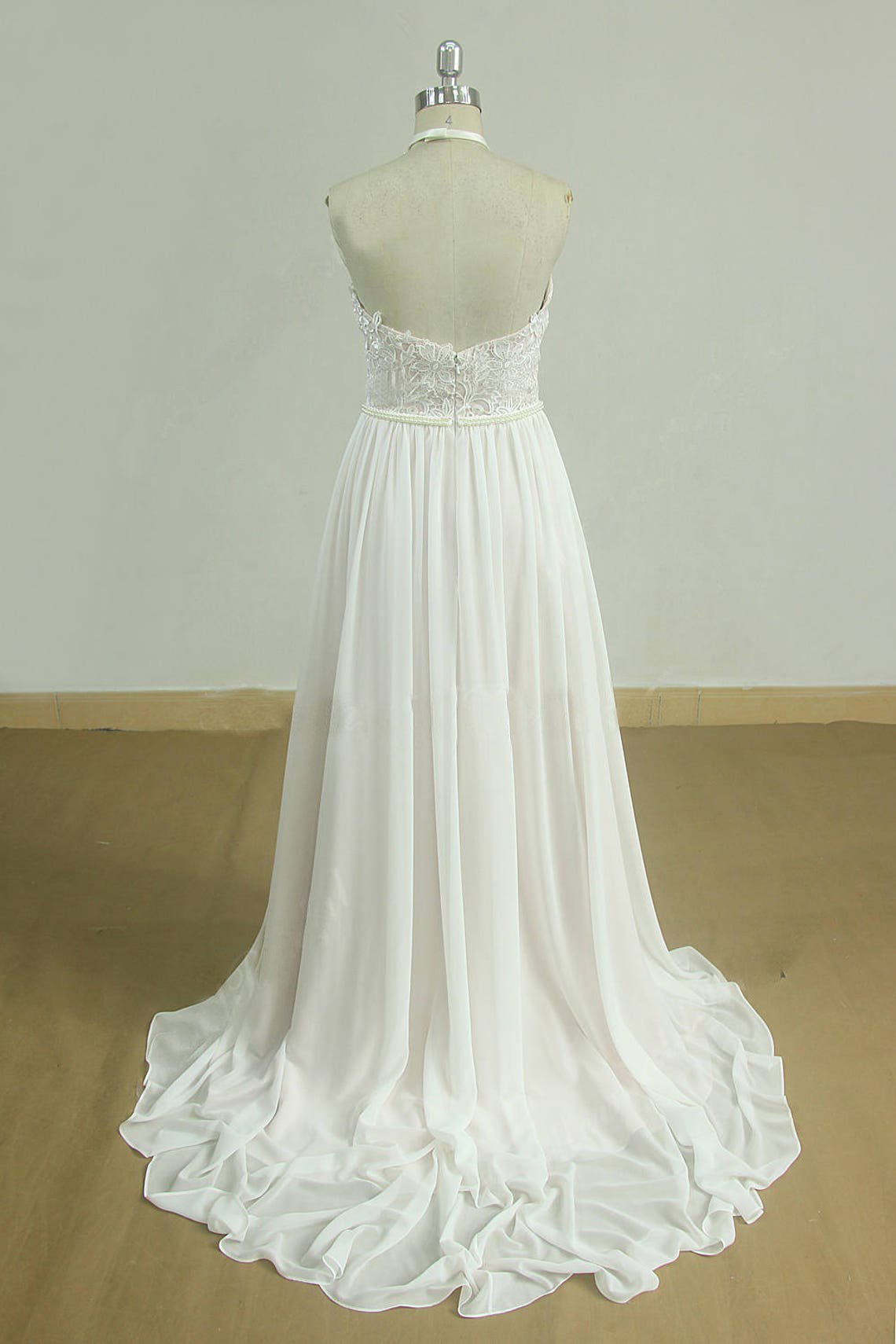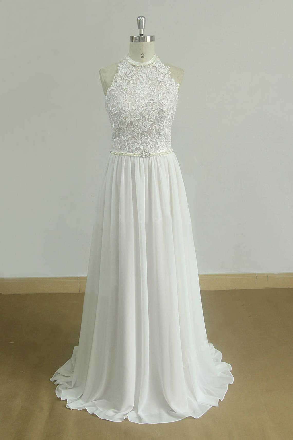 Halter Lace Chiffon Boho Wedding Dress with Pearl Neckline and Pearl Waistband