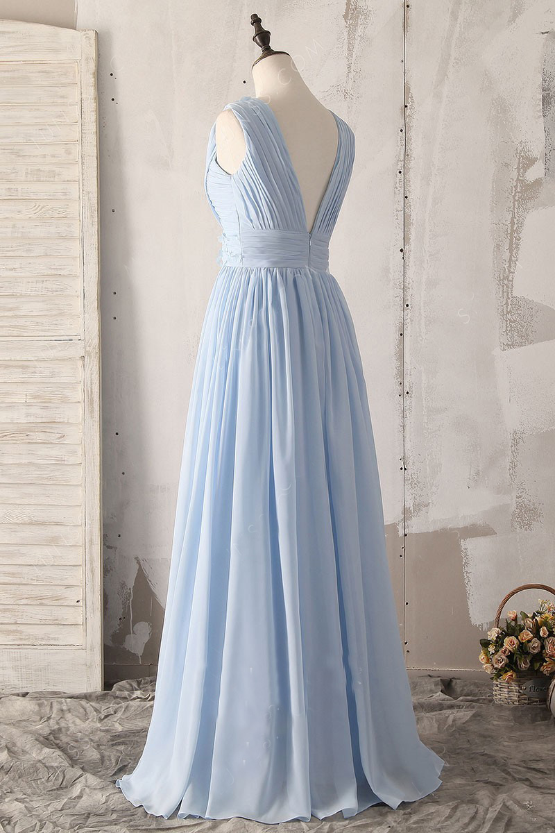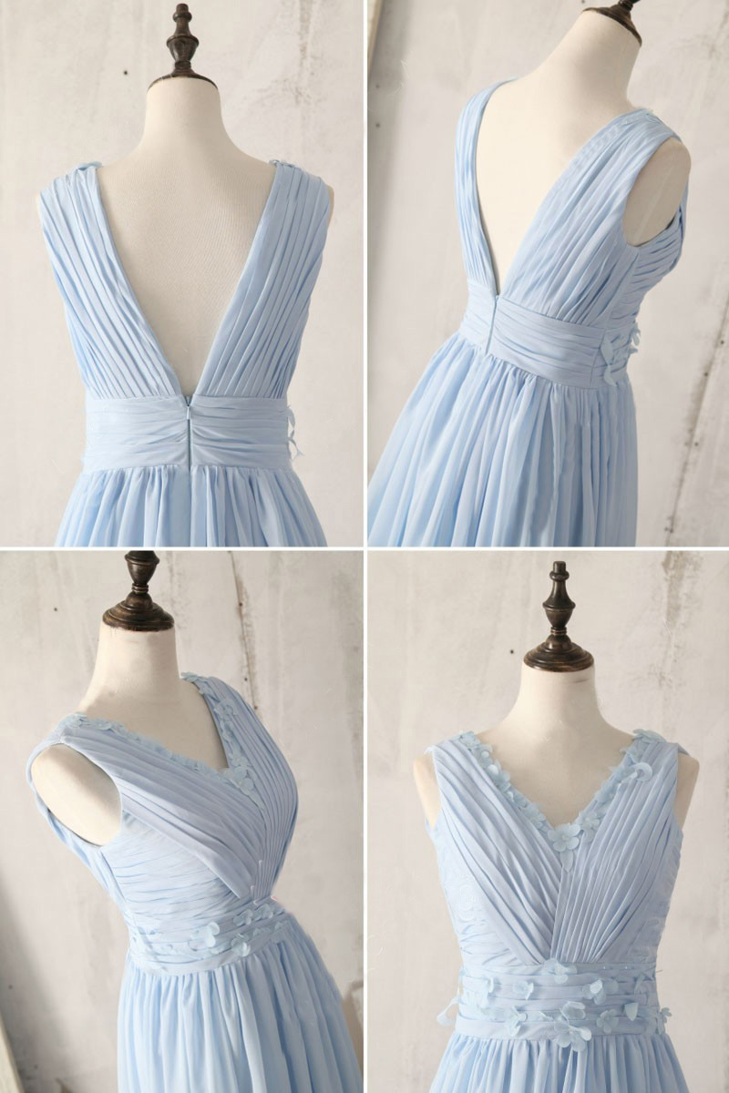 Chiffon Sleeveless Blue Prom Dresses with 3D Flowers, Long Evening Dresses
