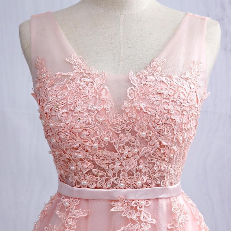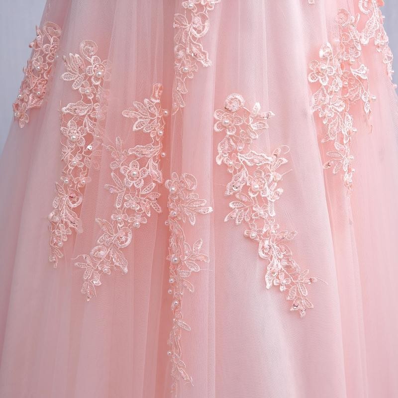 Pale Pink Evening Dress Prom Dress with Pearls Beaded Lace Appliques