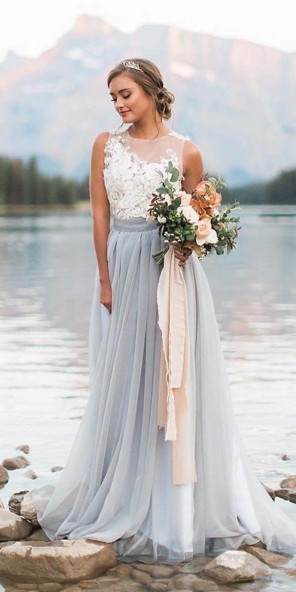 Grey Blue Tulle Boho Wedding Dresses A-line with White Appliques Coastal Bridal Gowns
